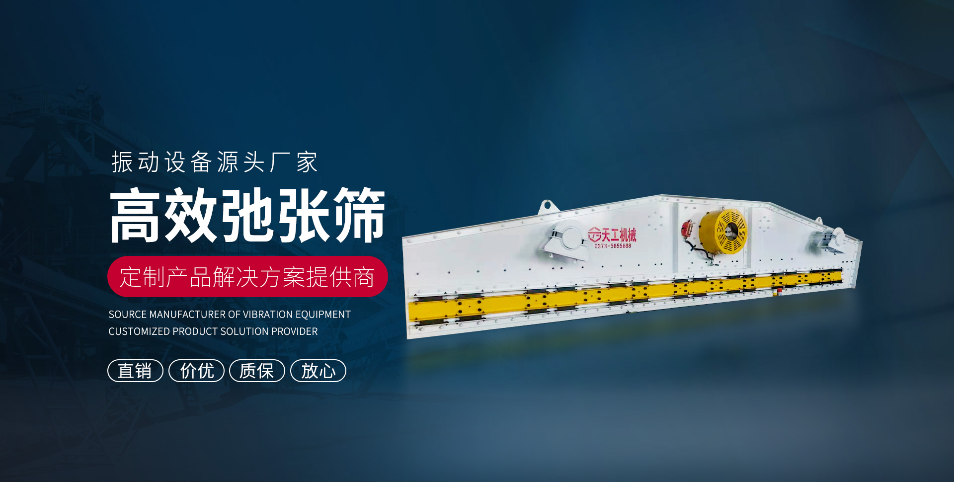 新鄉市天工機械設備有限公司生產各種用于電力、煤炭、氧化招、礦山、冶金等行業的機械設備,主要產品有高幅篩、香蕉篩、雙軸圓振篩、給料機、活化給煤機、輸送設備、激振器、振動電機、各種離分子篩板、襯板、減振彈簧、皮帶機托輥等系列。  公司致力于電力、煤炭、氧化鋁、礦山、冶金機械制造事業,專注于為客戶提供正確的解決方案,根據客戶的需求導向,幫助其解決問題,為其創造價值。在客戶的信任和支持下,也使得企業取得了持續發展。天工人將通過為客戶創造更多的價值、提供完善的服務,與客戶共謀發展。